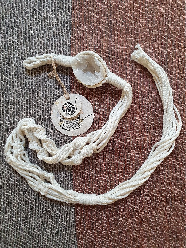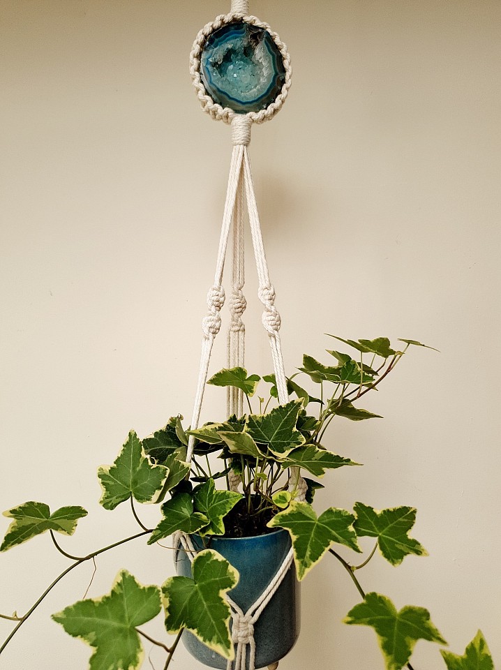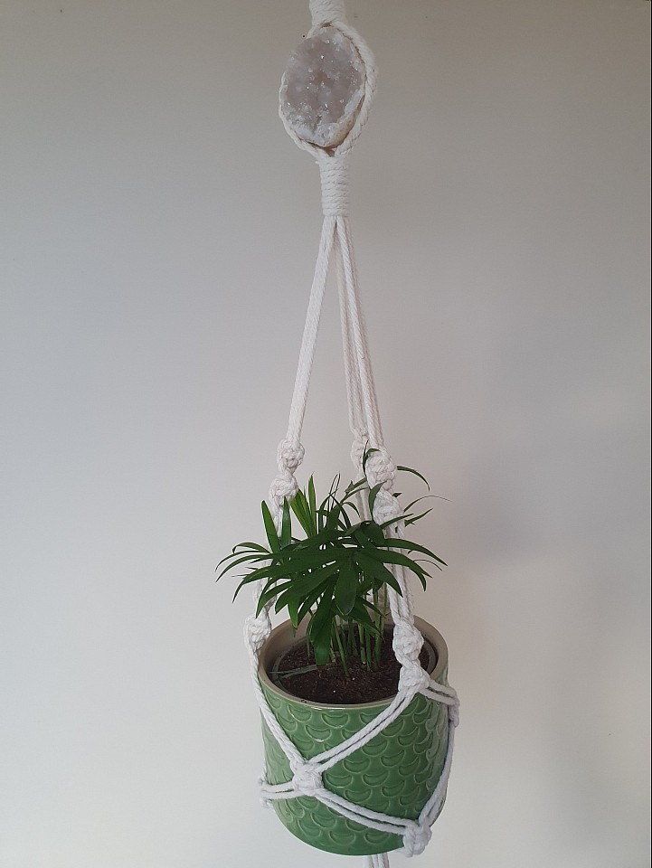 Three leg plant hanger with a quartz crystal cave.