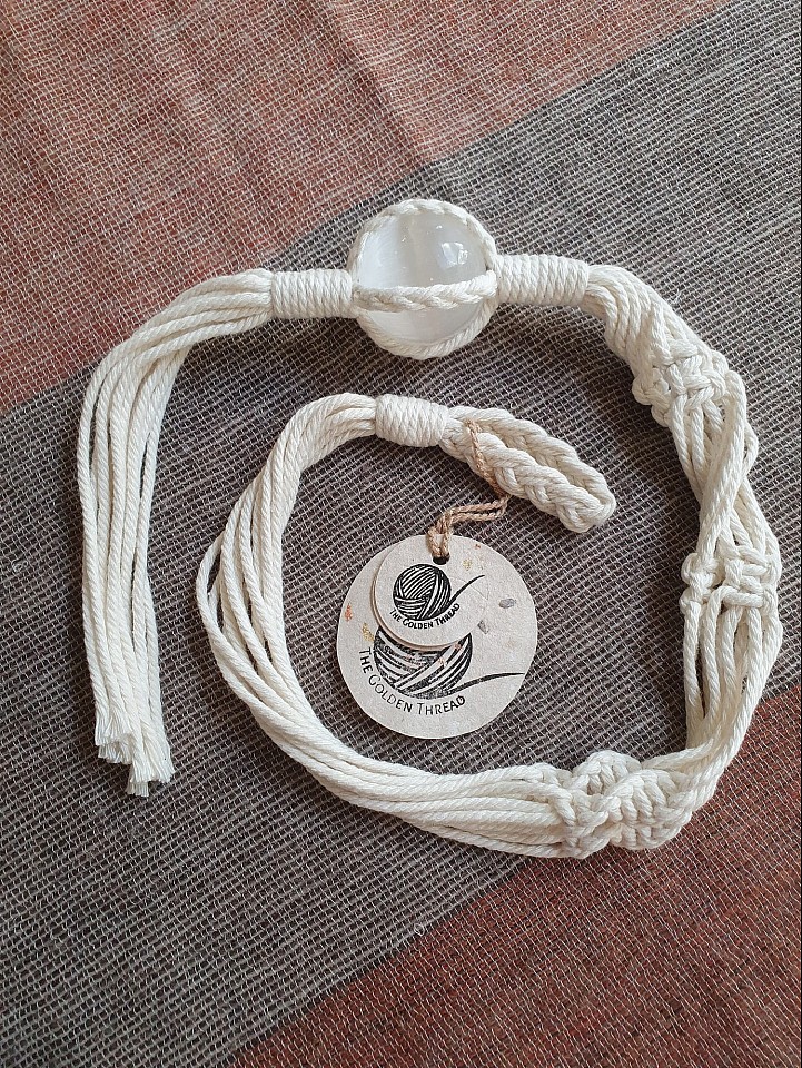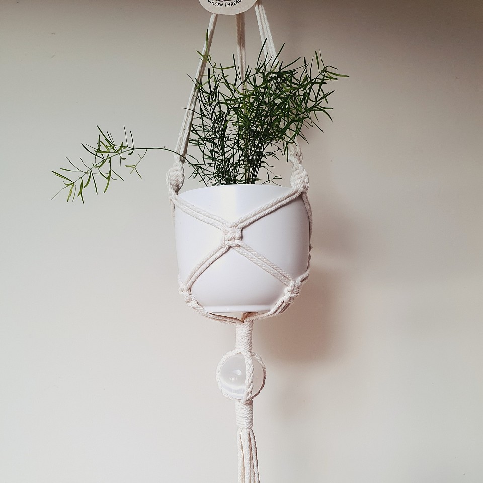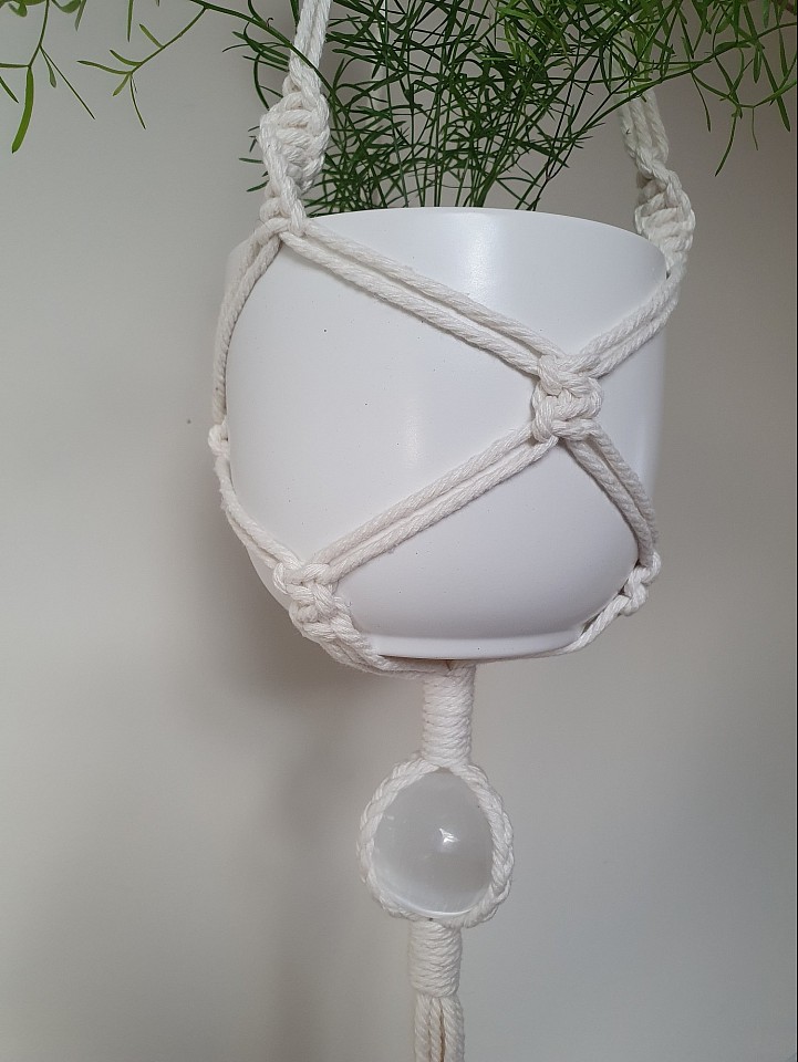 - 4.5cm selenite sphere held below the three leg plant hanger